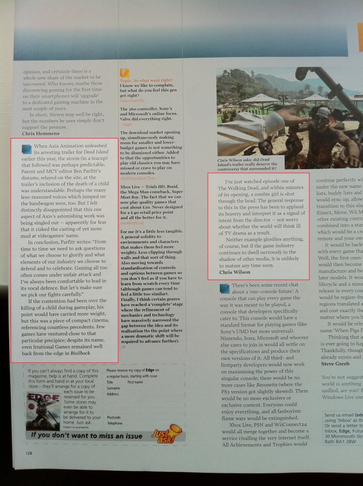 I was tipped off by last night about a letter in the most recent issue of Edge (228) concerning an Opinion piece I published in February discussing the Dead Island trailer released that month. Here it is.